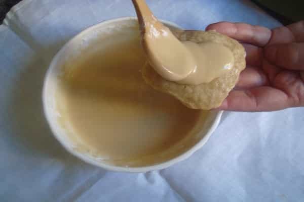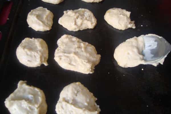 Enmantequillar la lata del horno, poner cucharadas de la masa obtenida, separadas unos 5 centímetros entre sí, hornear a fuego medio durante 15 minutos. Retirar del horno y enfriar.
