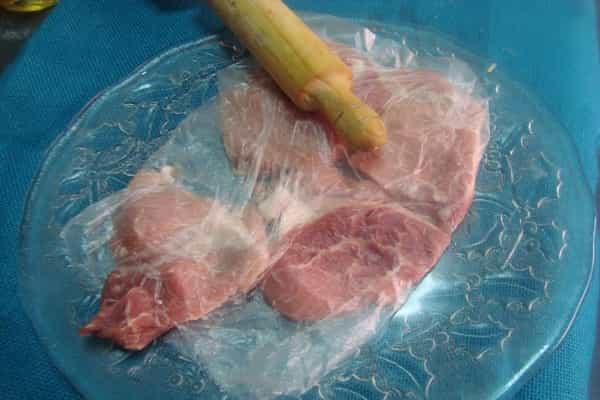 Cada trozo de cerdo cubrirlo con papel plástico y golpearlo suavemente para adelgazarlo y extenderlo.