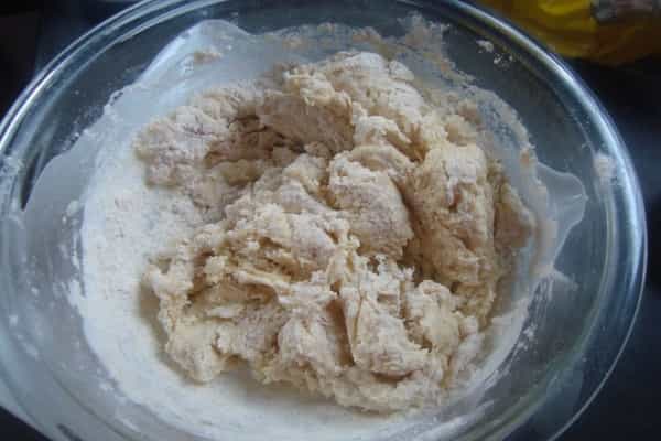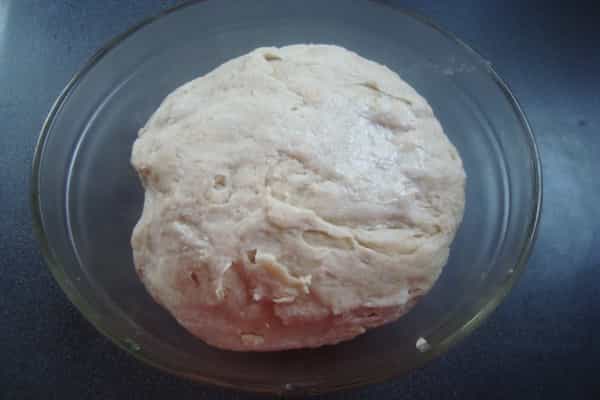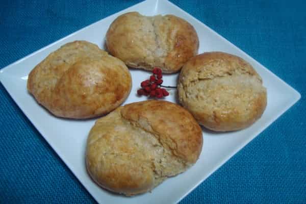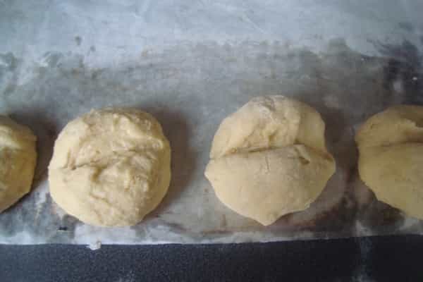 Pasado el tiempo de reposo, traspasar la masa a una mesa enharinada y hacer bollitos, colocarlos en la lata del horno con papel mantequilla enmantequillado separados, con un cuchillo hacer un corte en el centro de los bollos, dejar reposar tapados por 15 minutos. Pincelar los bollos con el huevo ligeramente batido, mezclar 4 cucharadas de azúcar con un poco de agua, colocar esta preparación en el centro de los bollos donde se realizo el corte con el cuchillo.
