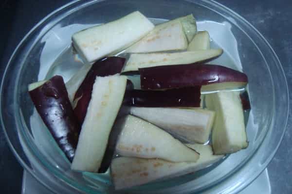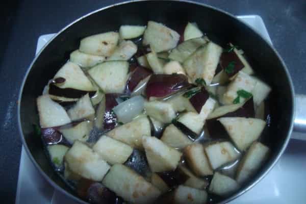 En una olla con aceite de oliva, sofreír por 5 minutos la cebolla picada en cubos pequeños y el ajo picado, añadir las berenjenas escurridas, cocinar por 5 minutos a fuego bajo. Incorporar el caldo, perejil fresco lavado, sazonar a gusto, cocinar, llevar a ebullición suave, y cocinar por 10 minutos.