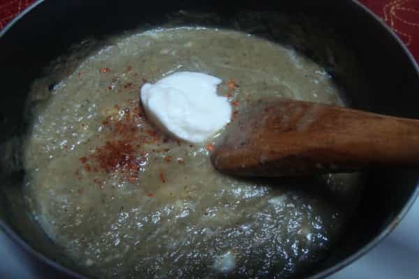 Retirar la olla del fuego, verter la preparación a una juguera o procesadora, moler todos los ingredientes hasta obtener una crema lisa y suave. La crema de berenjenas tiene que quedar sin grumos de ningún tipo, verter la crema en una olla, incorporar el yogurth natural y pimentón dulce, rectificar sazon, revolver, cocinar por 5 minutos.