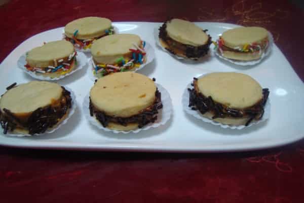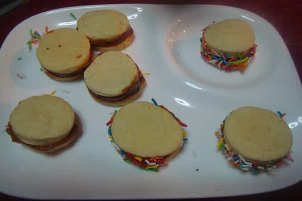Es importante que no se doren, solo la base. Retirar del horno y desprender con cuidado con ayuda de una espátula, dejar enfriar. Formar los alfajores de maicena uniendo dos círculos de masa con manjar, presionar suavemente para que se peguen, colocar manjar el contorno y decorar con coco rallado, virutas de chocolate o mostacillas de colores.