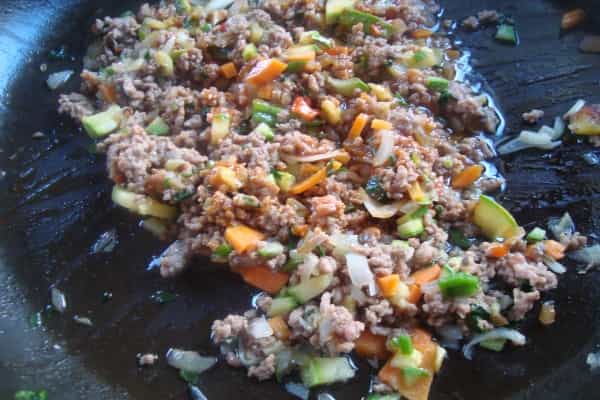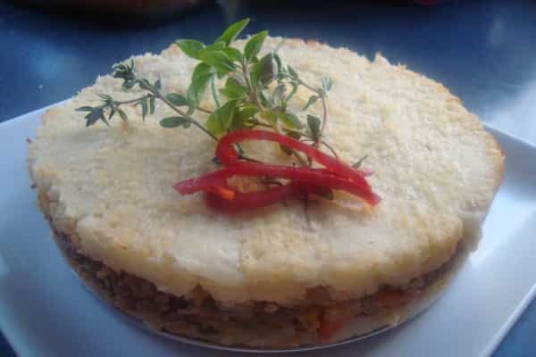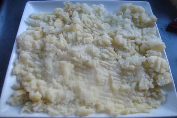 Armar el pastel, en un molde desmoldable colocar la mitad de la coliflor molida, con ayuda de una cuchara aplastar, alisar completamente, luego verter el sofrito de verduras y carne, tapar con otra capa de la coliflor molida.