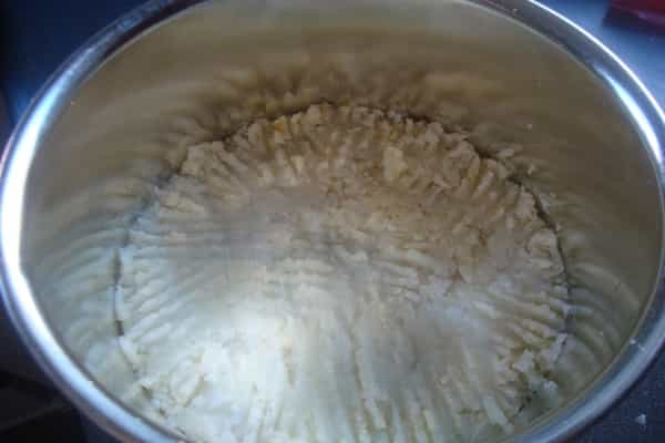 Con un tenedor, aplastar la coliflor en el mismo colador en el que está, para así eliminar totalmente el líquido, rectificar el sazón.
