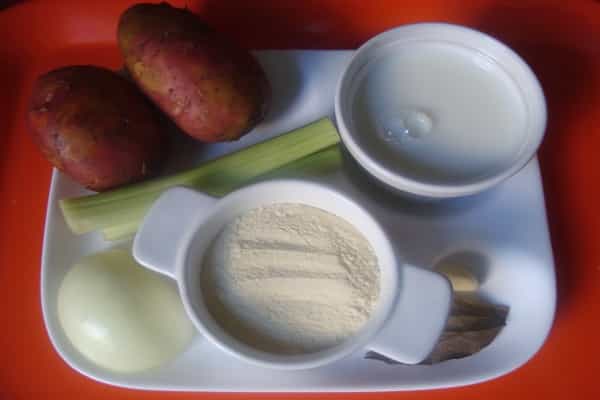 -½ kilo de papas -½ cebolla mediana -1 trozo de apio -2 hojas de laurel -1 diente de ajo -Leche -Aceite de oliva -Sal – Pimienta -200 gramos de harina de maíz -1 cucharada de harina sin polvos de hornear Preparación Lavar, pelar y cortar las papas en cuadrados de 2 centímetros. Lavar y cortar la cebolla, el apio, picar el diente de ajo. En una olla con aceite de oliva sofreír la cebolla, el diente de ajo y el apio, agregar las papas, cocinar por 5 minutos, añadir 1 litro de agua, las hojas de laurel y cocinar tapado a fuego medio por 20 minutos o hasta que las papas estén blandas.