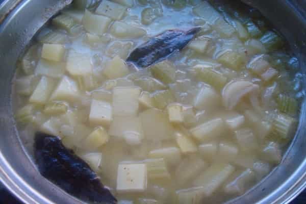 Retirar las hojas de laurel y verter la preparación en la juguera, tritura hasta obtener una crema homogénea no muy espesa. No licuar mucho tiempo, ya que la papa tiende a engomarse si la bates mucho, si es necesario, agrega un poco de leche para diluir un poco, salpimentar a gusto.