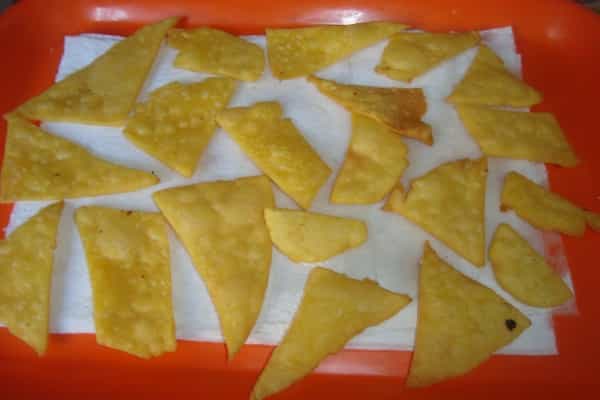 Preparar unos nachos caseros mezclando la harina de maíz, harina sin polvos de hornear, salpimentar a gusto, agregar un chorro de aceite de oliva, incorporar agua caliente hasta formar una masa homogénea y compacta. Dejar reposar por 10 minutos.