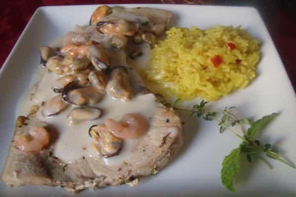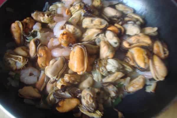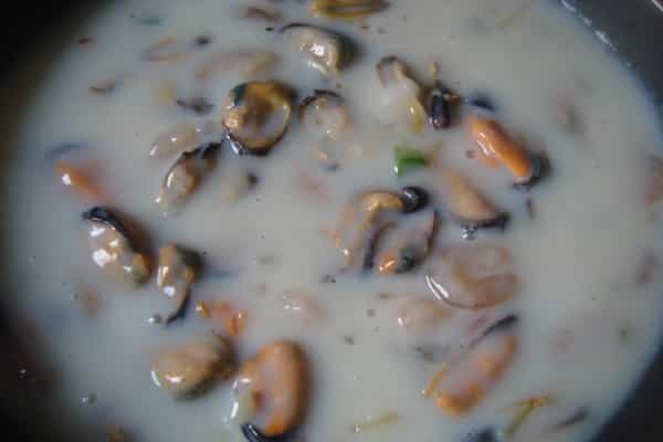 En una olla mezclar leche, maicena, 1 taza de líquido de la cocción de los mariscos, sazonar a gusto, llevar a cocción revolviendo constantemente hasta que hierva, incorporar los mariscos, mezclar, reservar. (A esta salsa se puede agregar 1 cucharada de mantequilla, 1 cucharada de salsa de tomates, vino blanco, ralladura de nuez moscada).