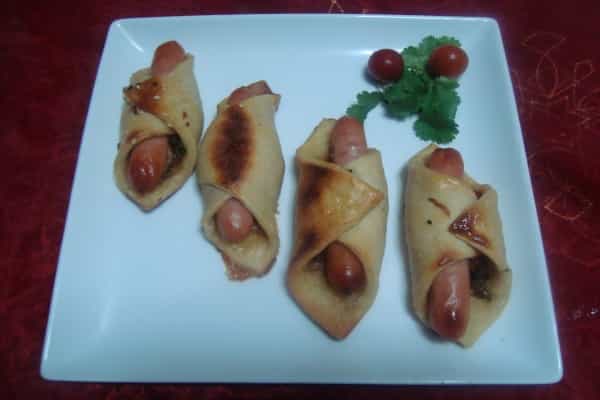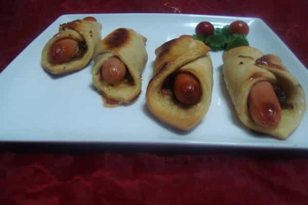 Pintar los chorizos encamisados con yema de huevo batida. Colocar en la lata del horno enaceitado, cocinar por 10 a 15 minutos en horno precalentado, hasta que la masa este dorada. Servir tibio.