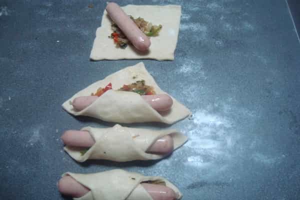 Transcurrido el tiempo, traspasar la masa a una mesa enharinada, uslerear hasta obtener el grosor deseado, cortar cuadrados de masa del largo del chorizo, en el centro colocar una cucharada del sofrito de verduras, luego un chorizo, pintar los bordes de la masa con yemas batidas, cerrar los extremos de la masa.
