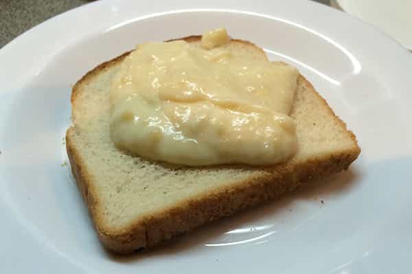 Tapamos nuestro sándwich y encima de él, en la tapa, le volvemos a poner salsa bechamel, ya que, bueno, ¿queremos un desayuno de campeones no? Y encima le ponemos los trocitos de queso.