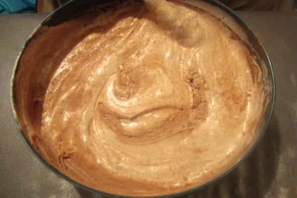 Preparar el molde de la torta, forrar con papel mantequilla, enmantequillado, verter la preparación en el molde. Hornear por 20 a 25 minutos en horno precalentado, revisar con una brocheta el centro del bizcocho, para verificar la cocción. Una vez que el bizcocho de chocolate esté listo, retirar del horno, enfriar, retirar del molde, eliminar el papel mantequilla. Preparar un merengue italiano, para esto en una olla pequeña colocar 1 taza de azúcar y 125 centímetros cúbicos de agua (cc), llevar a fuego hasta que forme un almíbar (dejar hervir unos 10 minutos). En un recipiente batir 4 claras hasta que estén firmes, en este punto incorporar de a poco el almíbar, seguir batiendo hasta obtener un merengue firme. Reservar.