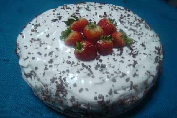 Colocar el tercer disco de bizcocho. Cubrir la torta con el merengue preparado, esparcir en la superficie y en los lados, rallar el chocolate en barra, espolvorear el chocolate rallado sobre el merengue, decorar con las frutillas reservadas. Refrigerar toda la noche, antes de servir.