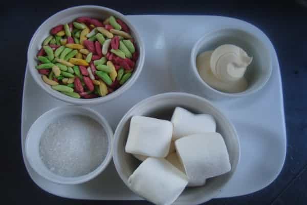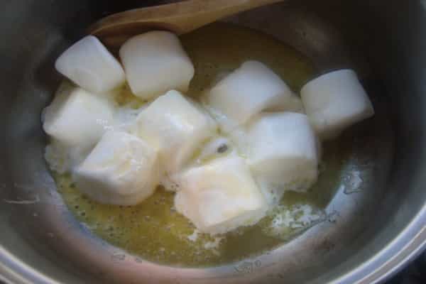 -1 bolsa de marshmallow (300 gramos) -125 gramos de mantequilla -200 gramos de cereales de trigo inflados -1 taza de azúcar Preparación En una olla a fuego bajo, derretir la mantequilla, agregar poco a poco los marshmallow, sin dejar de revolver hasta que se vayan derritiendo.