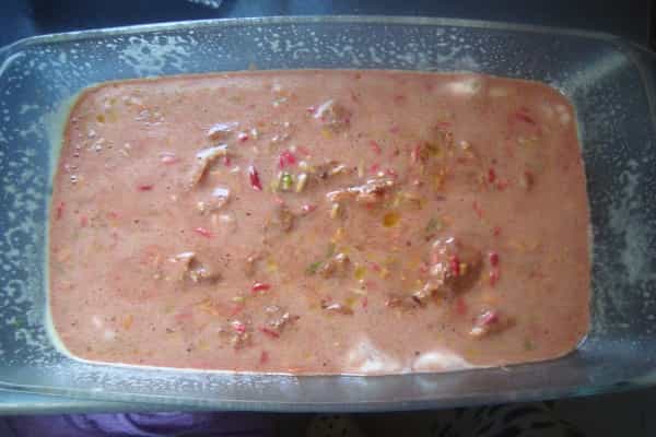 Forrar un molde cuadrado bajo con papel de aluminio (también le puedes untar un poco de aceite), verter la mezcla.