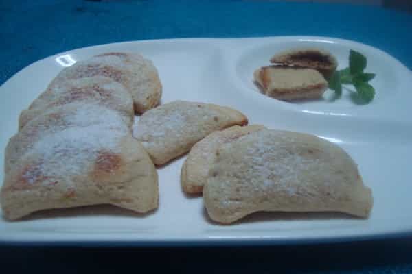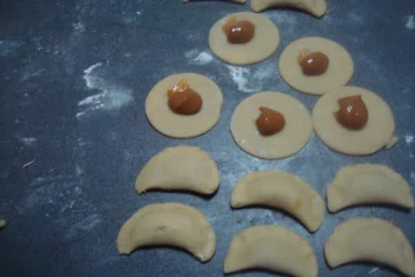 Enharinar la mesa, con ayuda de un uslero estirar la masa, cortar círculos. Puedes hacer las galletas de dos maneras, primero agregando una cucharada de manjar en el centro de un círculo de masa y tapándolo con otro circulo de masa, luego cerrar los bordes. Como segunda alternativa, puedes colocar el relleno de manjar en el centro del circulo de masa y cerrar doblando el circulo por la mitad, como una mini empanada, presionando los bordes para que queden bien selladas.