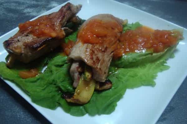 Colocar los churrascos rellenos en una sartén con 1 cucharada de aceite de oliva caliente y grillarlos (dorarlos) por ambos lados. Preparar la salsa picante colocando en una olla los tomates picados, la salsa de tomates, el ají picado fino o las cucharadas de ají en pasta, saltear hasta que el tomate esté cocido. Servir los churrascos rellenos, bañados en la salsa picante caliente, acompañar de arroz o ensaladas. Lo mejor de la cocina es que puedes crear nuevos e ingeniosos platos sólo con unos cuantos ingredientes y mucha imaginación. Estos Rollitos de carne y salsa picante son la mejor muestra de que en un mismo alimento podemos encontrar una infinidad de preparaciones, y disfrutar así de los mejores sabores salidos directamente de nuestra cocina.