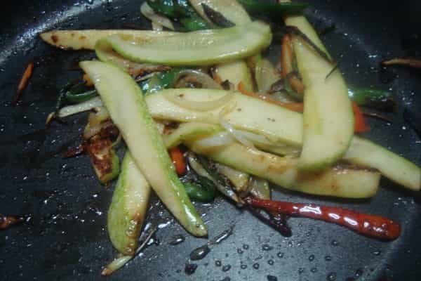 En el mismo sartén sofreír por 5 minutos el pimentón, zapallo italiano y cebolla, todo cortado en tiras, salpimentar a gusto.