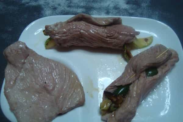 Rellenar los churrascos sellados, con el sofrito de verduras, cerrar con un mondadientes o un palo de brocheta.