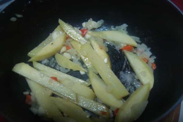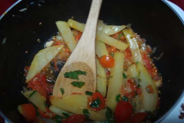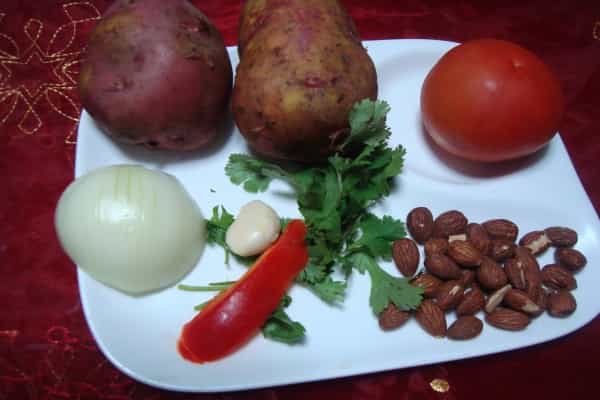 -4 papas, peladas y cortadas en tiras -½ cebolla picada -½ taza de almendras -2 tomates medianos -1 trozo de cebolla -1 diente de ajo -1 cucharada de pimentón picado -1 cucharada de cilantro picado -1 ½ litro de caldo -200 gramos de harina de maíz -1 cucharada de harina sin polvos de hornear -Aceite de oliva -Sal Preparación En una olla con aceite de oliva caliente sofreír por 5 minutos a fuego medio, ½ cebolla picada, pimentón y las papas.