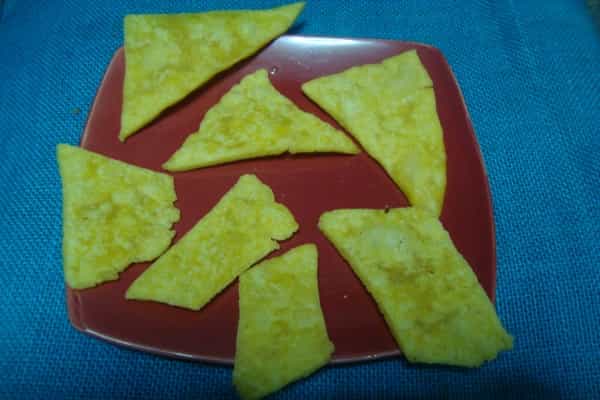 Verter sobre las papas, cocinar hasta que hierva y se reduzca un poco, agregar el caldo. Sazonar con sal y cocinar a fuego bajo hasta que las papas queden bien cocidas. Preparar nachos caseros para acompañar esta sopa, mezclar las harinas, una pizca de sal, un chorro de aceite, agregar pequeñas cantidades de agua hasta formar una masa suave, dejar reposar. Uslerear la masa entre dos plásticos, retirar el plástico superior y cortar con un cuchillo triángulos que formen los nachos, pasar a una bandeja, llevar al congelador por 1 hora. Freír en abundante aceite, retirar, escurrir con papel absorvente, reservar.