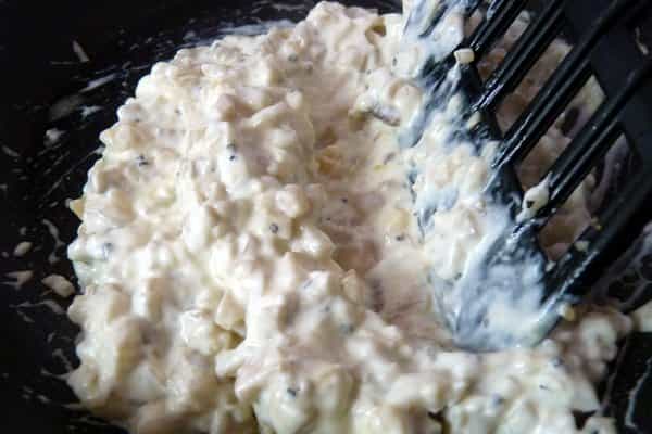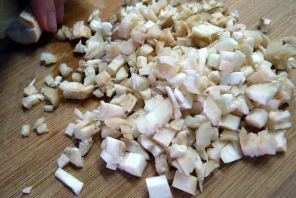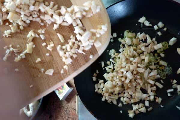 Picar los tallos de lo champiñones en trozos pequeños. Cortar el queso parmesano y el ajo en rebanadas pequeñas. En un sartén calentar el aceite de oliva y agregar el ajo, sofreír hasta que éste se dore. Agregar los tallos de champiñón, el queso parmesano, queso crema y la pimienta. Mezclar bien todos los ingredientes y retirar del fuego.