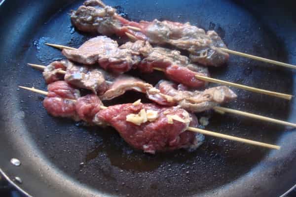 Transcurrido el tiempo, ensartar las tiras de carne marinada en palos de brochetas. En un sartén con 2 cucharadas de aceite de oliva caliente, colocar las brochetas sin el liquido de la marinada (reservarlo) y sellar la carne hasta que esté dorada por ambos lados.