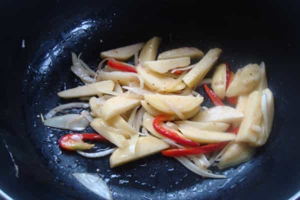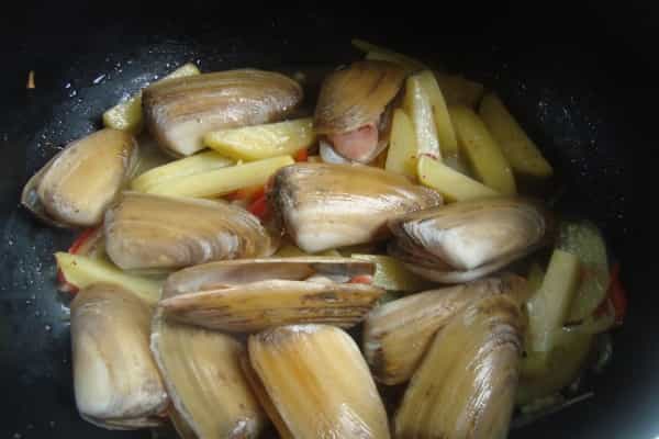 Incorporar las machas limpias, agregar 2 litros de agua y el vino, salpimentar a gusto, cocinar por 15 minutos, agregar el arroz, cuando el arroz esté blando y las papas estén cocidas, apagar el fuego.