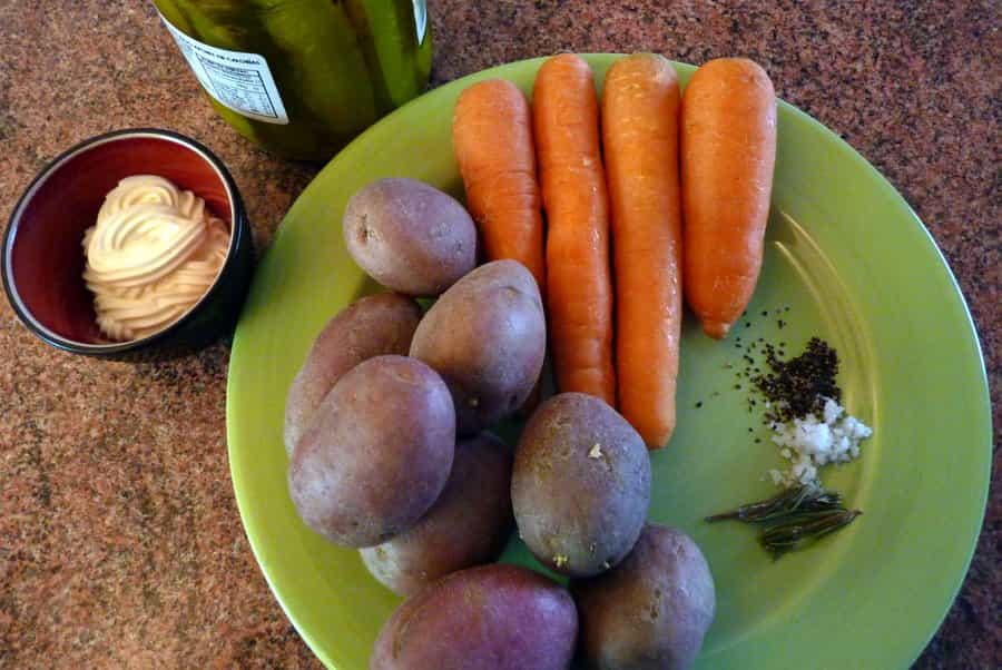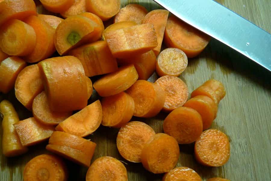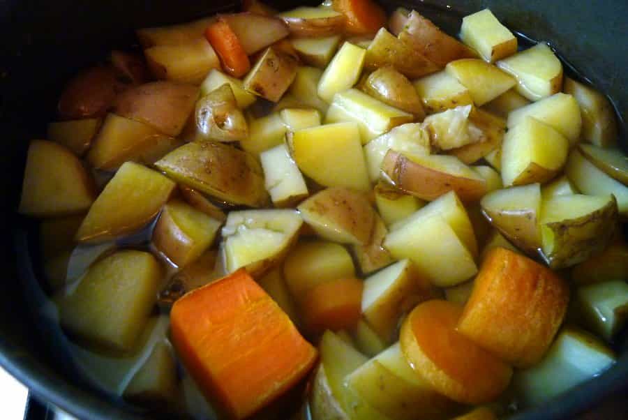 Lavar bien las papas y zanahorias y picar en trozos, el tamaño de éstos puede ser tan grande o pequeño como prefieras. En una olla poner las papas y zanahorias picadas junto a media cucharada de sal de mar. Cocinar a fuego medio por 20 minutos, hasta que las verduras estén tiernas