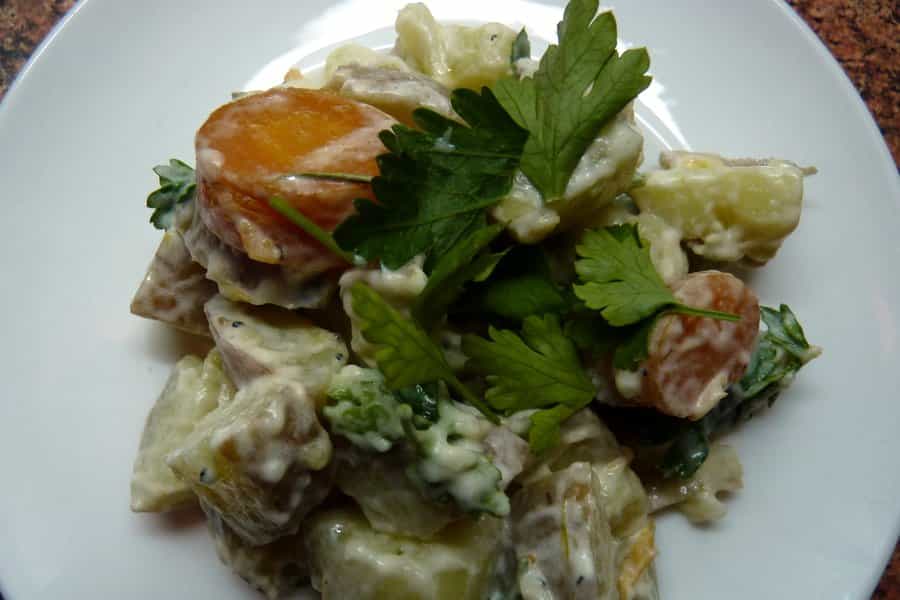 Uno de mis vegetales favoritos es la papa, me encanta lo versátil que es. Con ella puedes preparar por ejemplo sopas, puré y papas duquesas. Así como existen diversas preparaciones con papas, también hay múltiples variedades de ensalada rusa. Acá les presento una mezcla chileno-polaca. Ingredientes 8 papas medianas 4 zanahorias 2 pepinillos grandes 3 cucharadas de mayonesa 1 cucharada de aceite de oliva 1 manojo de perejil Sal, pimienta y romero a gusto Porciones 4 porciones Preparación