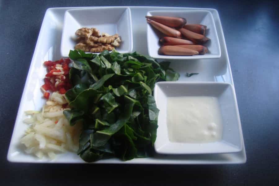 -3 acelgas -3 cucharadas de mantequilla -100 centímetros cúbicos (cc) de crema -½ cebolla -½ pimentón -1 diente de ajo -50 gramos de nueces -50 gramos de piñones cocidos -Sal – pimienta -Aceite de oliva Preparación En una olla grande calentar 2 litros de agua con 1 cucharada de sal. Lavar las acelgas con agua fría, eliminar los tallos y el centro de la acelga (deja solamente las hojas verdes). Cuando el agua este hirviendo, incorpora las acelgas, cocinar por 15 minutos a fuego medio en la olla tapada. Escurrir las acelgas, picarlas y reservar. En una olla o sartén derretir la mantequilla, sofreír por 5 minutos la cebolla, el pimentón y el ajo todo picado en cubos pequeños.