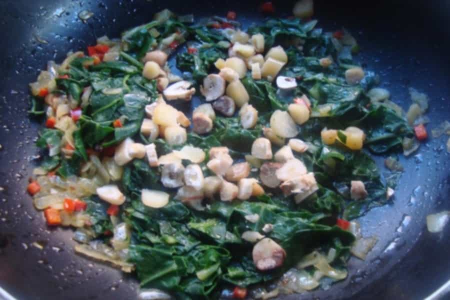 Agregar las acelgas picadas, salpimentar a gusto, cocinar por 5 minutos agregar las nueces y los piñones picados (reservar un poco para espolvorear el plato).
