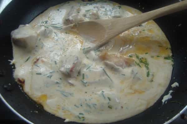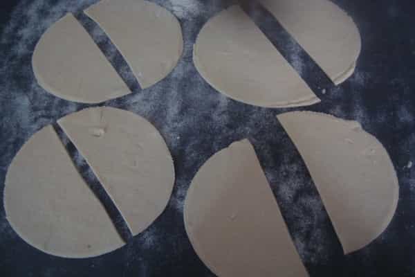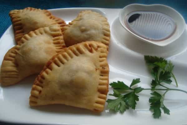 Enharinar una mesa, con ayuda de un uslero estirar la masa y cortar círculos, dividir cada circulo por la mitad, verter un poco del relleno de pollo preparado en cada semicírculo de masa, humedecer con agua los bordes de la masa y cerrar, con ayuda de un tenedor cerrar bien los bordes.