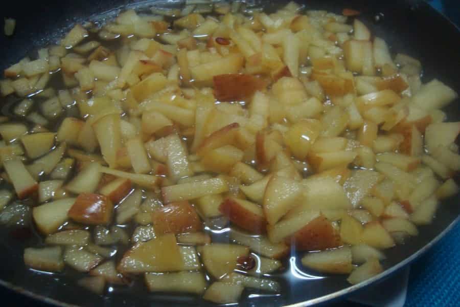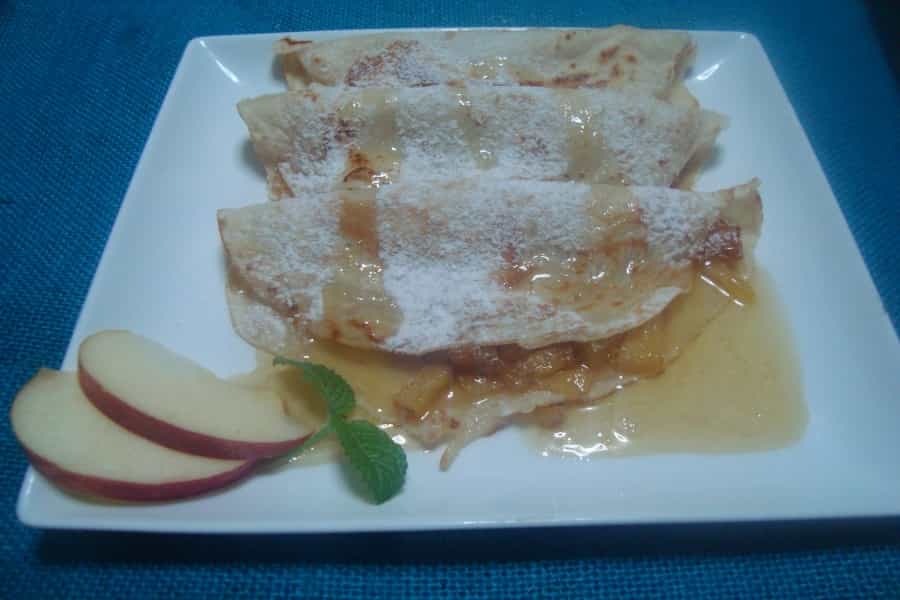 En un sartén con aceite caliente colocar un poco de la masa hasta cubrir el fondo, dejar dorar hasta que los bordes se vean tostados, dar vuelta el panqueque y dorar por ese lado, para que quede bien crujiente. Repetir esta operación hasta acabar con toda la masa. Preparar el relleno, cortar las manzanas con cascara en cuadritos. En un sartén con 2 cucharadas de mantequilla saltear por 10 minutos las manzanas picadas moviendo el sartén constantemente para que las manzanas no se quemen, verter las manzanas en un pocillo y reservar.