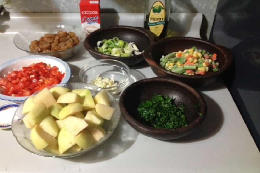 Si debo ser completamente honesta, nunca he sido fanática del cochayuyo. Excepto por un "Chupe" que hace mi mamá, no suelo consumirlo. Pero esta receta de guiso se veía interesante, así que la hice y ahora la comparto con ustedes. Obviamente, recibí ayuda de mi madre, así que puntos néctar para ella. Ingredientes: (yo hice esta receta para 4 personas, para que tengan claras las proporciones). -Ajo, 4 dientes. -Cebollín (1) o cebolla (1/2) -Pimiento Morrón (rojo en mi caso) (1/2) -Perejil, cilantro (la mitad del manojo), dependiendo de lo que ustedes prefieran -Sal a gusto -Aceite de oliva a gusto -Chochayuyo (los paquetes traen varias..."ramas", yo use una para esta receta) *Hay que dejar remojando el cochayuyo por una hora, para que sepan. -Papas (5) .-Crema espesa (una cucharada) -Condimentos (orégano, pimienta negra, aliño completo, caldo maggie de verduras, etc) -Ensalada primavera (yo use una bolsa chica, de esas que venden en los supermercados) Preparación: 1.- Una vez que han dejado remojando el cochayuyo, deben picarlo en trozos finos. Las papas también deben picarlas, sólo que en cuatro. Pican a su vez, el perejil, cebollín, ajo y el pimiento morrón, como pueden ver en la foto.