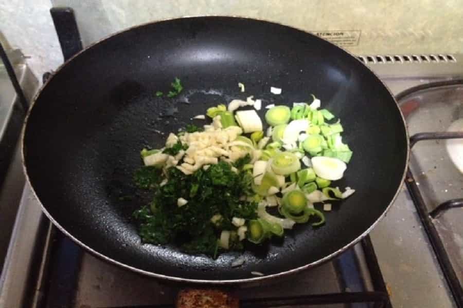 2.- Una vez tienen todo picado, ponen en una sartén con aceite de oliva caliente, el cebollín, el ajo y el perejil (3/4 de lo que tienen, el resto queda para adornar el plato).