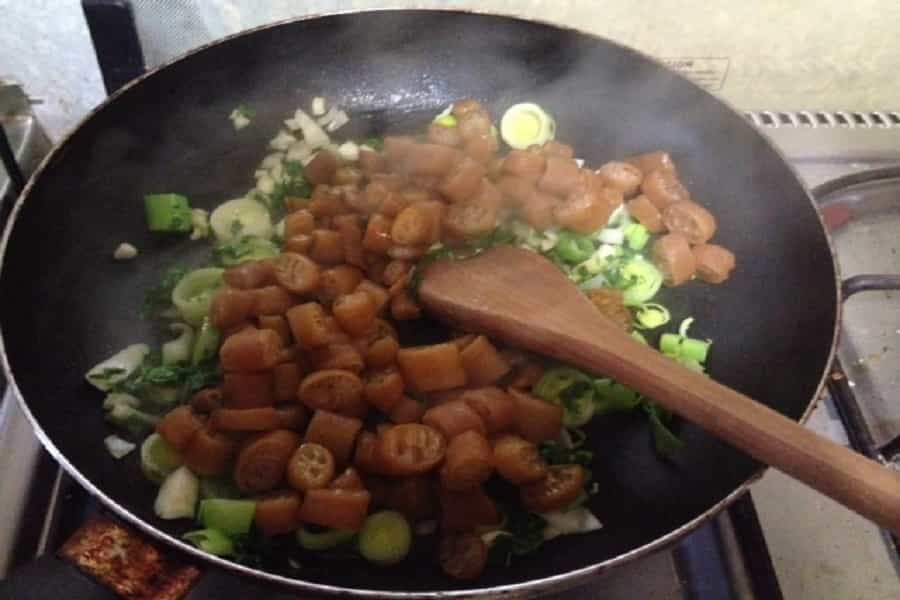 3.- Cuando ya esta comenzando a dorarse el cebollín, agregan el cochayuyo.