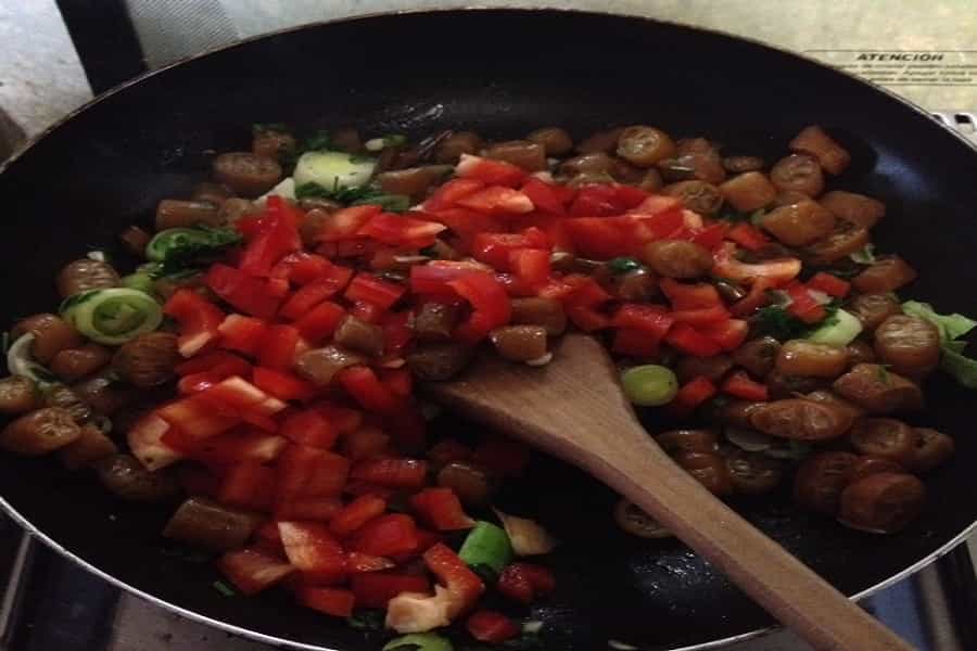 5.- Una vez que el cochayuyo a comenzado a cocinarse, agreguen el morrón. De vez en cuando pongan algo de agua en la sartén, para que no se les pegue la comida.