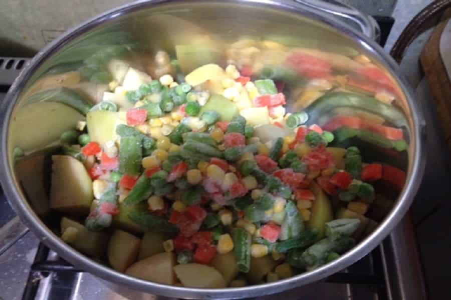 4.- En una olla aparte, ponen a cocer las papas con la ensalada primavera. Recuerden ponerle sal a la olla con agua hirviendo.