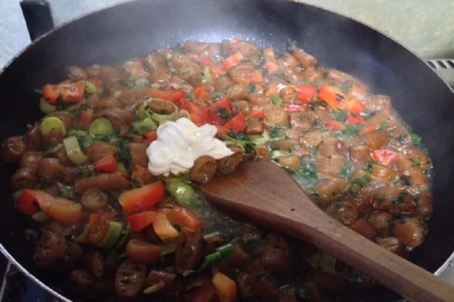 6.- Cuando ya han pasado unos 15 minutos del cochayuyo en la sartén, agreguen la cucharada de crema. Y dejen cocinar por unos 10 minutos más, después apaguen el fuego, cuando ya este todo listo.