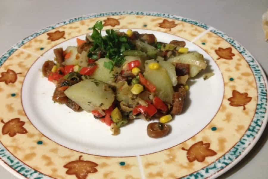 7.- Fíjense en las papas, deberían estar listas en unos 20 minutos. Una vez que eso este listo, boten el agua de la olla y mezclen el contenido de la sartén con las papas en la olla. Voilà! Ya tienen tener su guiso listo para servir. En total la receta toma como una hora en hacerse, sin contar la hora que toma dejar el cochayuyo en agua. Y recuerden, si lo hacen con cariño, todo queda bueno.