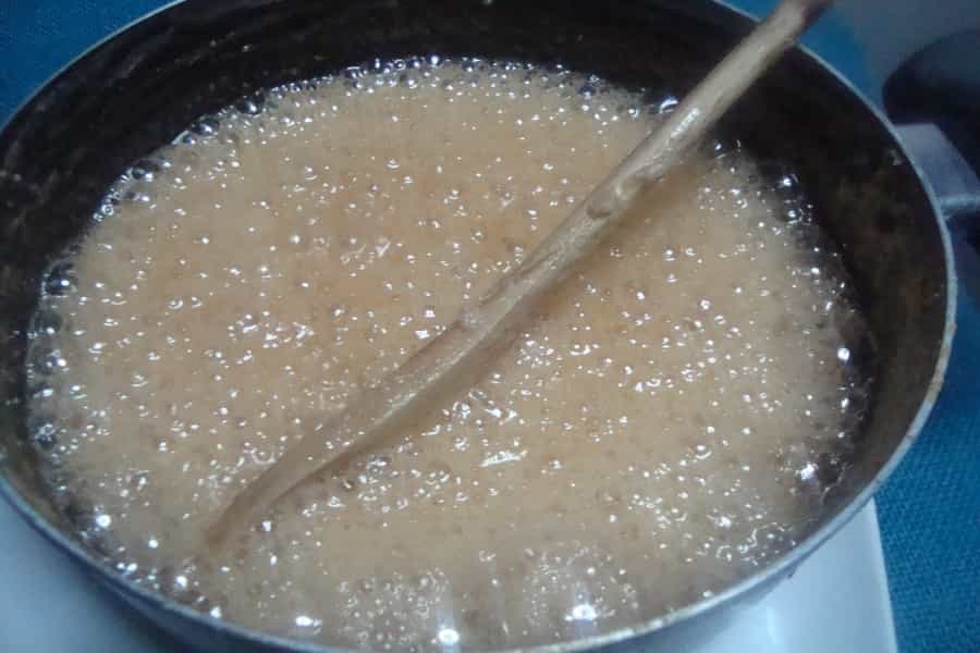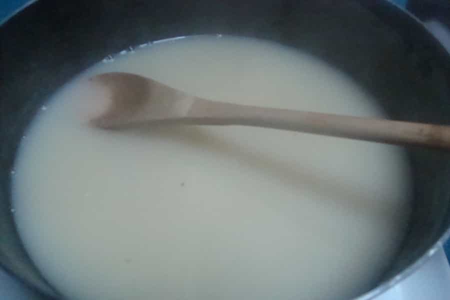 Cocinar revolviendo constantemente con una cuchara de madera hasta que la leche se torne de color dorado (alrededor de 30 minutos).