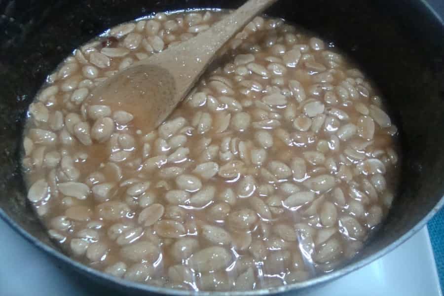 Retirar del fuego y seguir revolviendo enérgicamente por 5 minutos más. Añadir la taza de maní, mezclar.