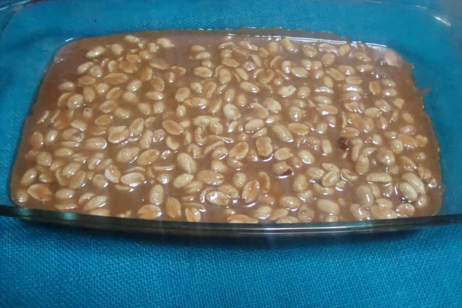 Verter la preparación en una fuente húmeda (mojada previamente), esparcir y dejar las tablillas de maní de 1 centímetro de alto. Esperar que la preparación se enfrié y cortar las tablillas del tamaño deseado.