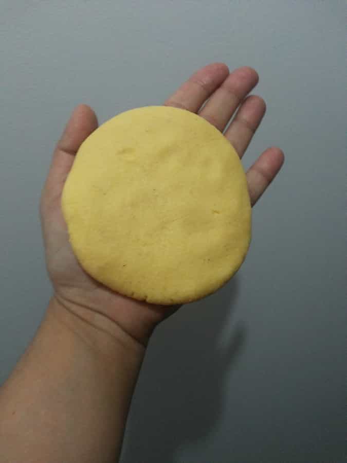 Una vez integrada toda la harina se va amasando con las manos y se puede rectificar el punto de sal y de agua, cuidando que quede una masa firme que no se pegue de las manos. Se hacen bolas y esta se aplasta con el fin de dejarlas como de un centímetro de grosor y cada una debe ser como del tamaño de la palma de la mano.