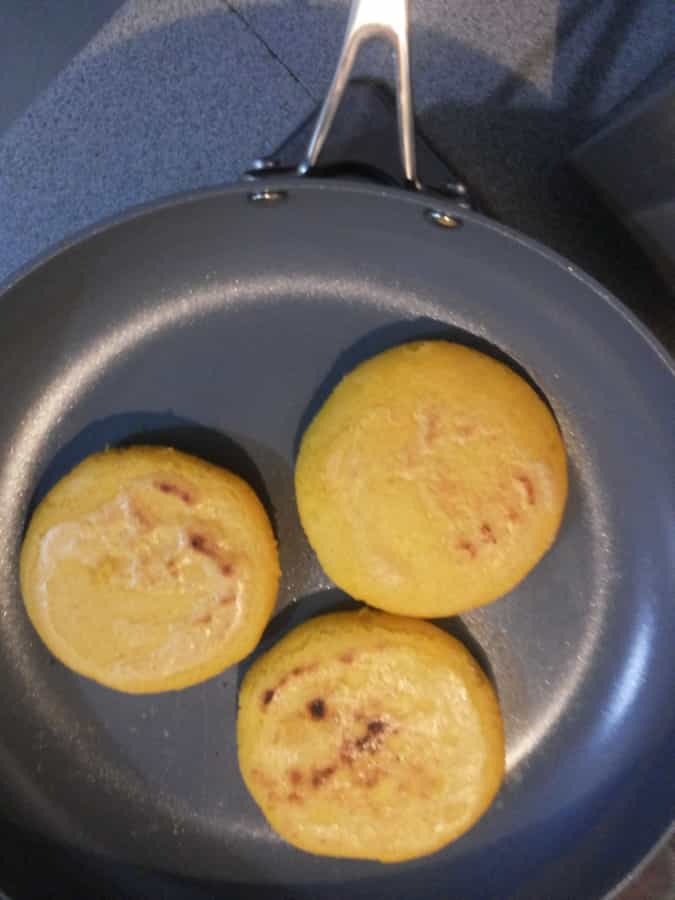 En una sartén con buen teflón, se colocan, se pueden tapar por 2 minutos para que se cocinen por dentro y luego se destapan y se van dorando por lado y lado. Hay otras variables, como la arepa frita y esta misma pero llevada al horno para que se cocine por dentro. Lo importante es que esté bien cocida la masa.