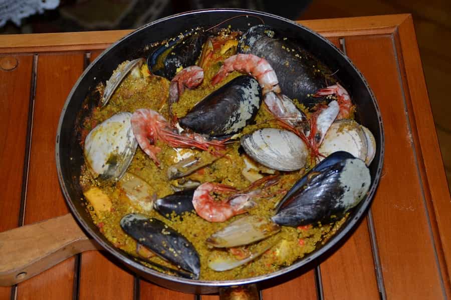 La paella es un tradicional plato español, que puede llevar una gran variedad de mariscos, carnes cecinas o lo que tu desees. Esta receta es tradicionalmente a base de arroz, sin embargo en esta ocasión te presento la receta en base de la muy nutritiva y proteica Quinoa. Ingredientes (8 personas) - 1 pimentón rojo - 1 pimentón verde - 1 pechuga de pollo - 1 tomate grande picado pequeño o molido - 16 (o mas) almejas en concha - 16 (o más) choritos en concha - 16 (o más) machas en conchas - 16 (o más) gambas (también puedes usar camarones) - Azafrán - Perejil - 2 dientes de ajo - 3 tasas de quinoa - Alternativas al azafrán: Curry y Cúrcuma Preparación Aunque parece una receta complicada por la cantidad de ingredientes, verás que es muy simple de preparar. Recuerda que para preparar la quinoa debes remojarla al menos 20 minutos y utilizar una vez escurrida toda el agua. Comienza por picar los los pimentones, el pollo y el tomate en cuadritos. Si has utilizado una pechuga entera de pollo, utiliza los restos para preparar un caldo, de otro modo puedes usar un caldo en caluga comprado en el supermercado.