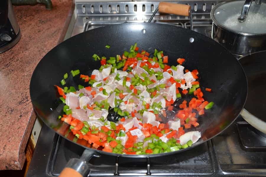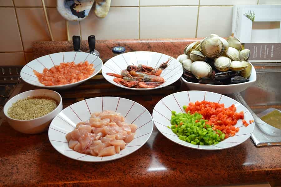 En un mortero, agrega el perejil y los dientes de ajos. Si has podido encontrar azafrán, agrega las ramitas de azafrán y machaca bien los ingredientes. Reserva. Por otro lado, lava bien las conchas y las gambas y reserva. En una paellera (también sirve un wok o sartén grande) saltea el pollo y los pimentones con un poco de aceite de oliva. Una vez que el pollo esté bien sellado, agrega el tomate y cocina por 5 minutos y condimenta con sal y pimienta.