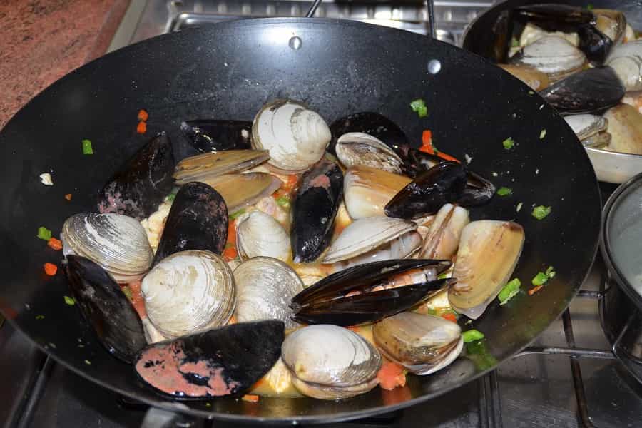 Finalmente agrega los ingredientes que habías machacado previamente y pon las conchas en la paellera. Cocina por 5 minutos más.