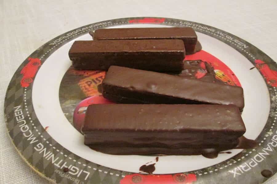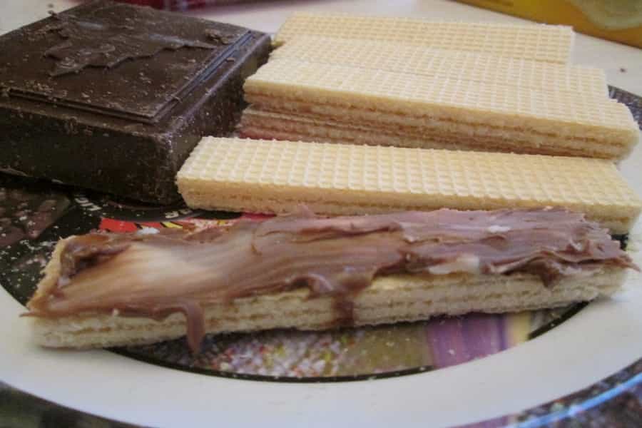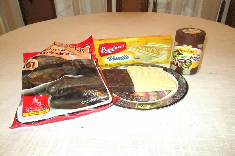 -½ kilo de chocolate para cobertura. -1 frasco de crema de chocolate ( tipo nutella ) -1 Paquete de obleas de vainilla. Preparación: 1.- Unte una galleta con la crema de chocolate y únala con otra.